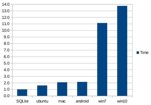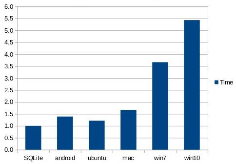 The chart shows that on Windows10, content can be read from the SQLite database about 5 times faster than it can be read directly from disk. On Android, SQLite is only about 35% faster than reading from disk.